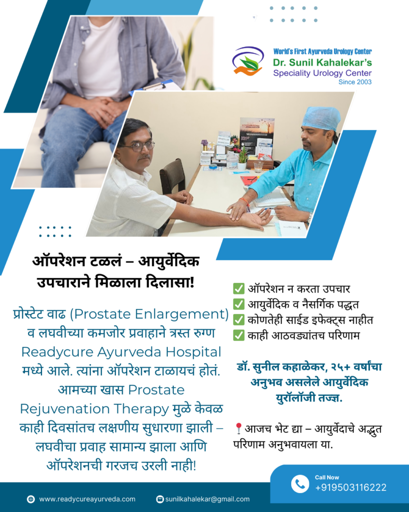 प्रोस्टेट वाढ (Prostate Enlargement) ही वयोमानानुसार अनेक पुरुषांमध्ये आढळणारी एक सामान्य समस्या आहे. यामध्ये लघवीचा प्रवाह मंद होतो, वारंवार लघवी लागते किंवा लघवी करताना त्रास होतो. अनेकदा अशा परिस्थितीत डॉक्टर ऑपरेशनचा सल्ला देतात. मात्र, आयुर्वेदामध्ये या समस्येवर सुरक्षित व प्रभावी पर्याय उपलब्ध आहे – तो म्हणजे Prostate Rejuvenation Therapy.