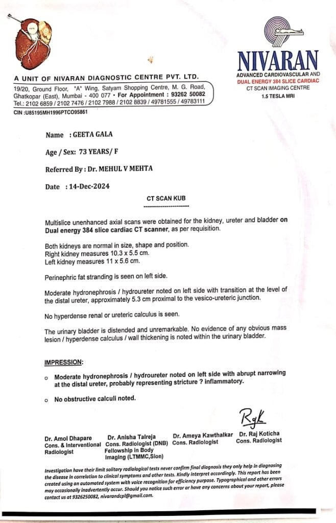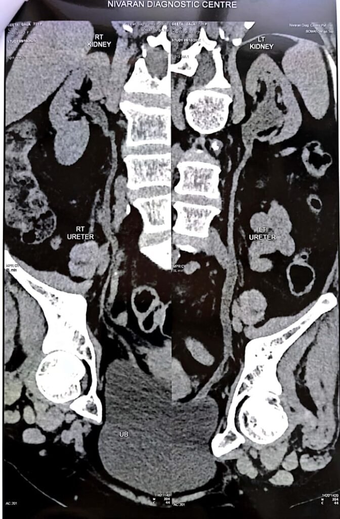 रुग्णाला कंबरदुखी, लघवीचे त्रास, व मूत्रपिंड सुजणे (Hydronephrosis) अशी गंभीर लक्षणे होती. CT Urogram तपासणीत मूत्रवाहिनीतील अरुंदी निश्चित झाली.